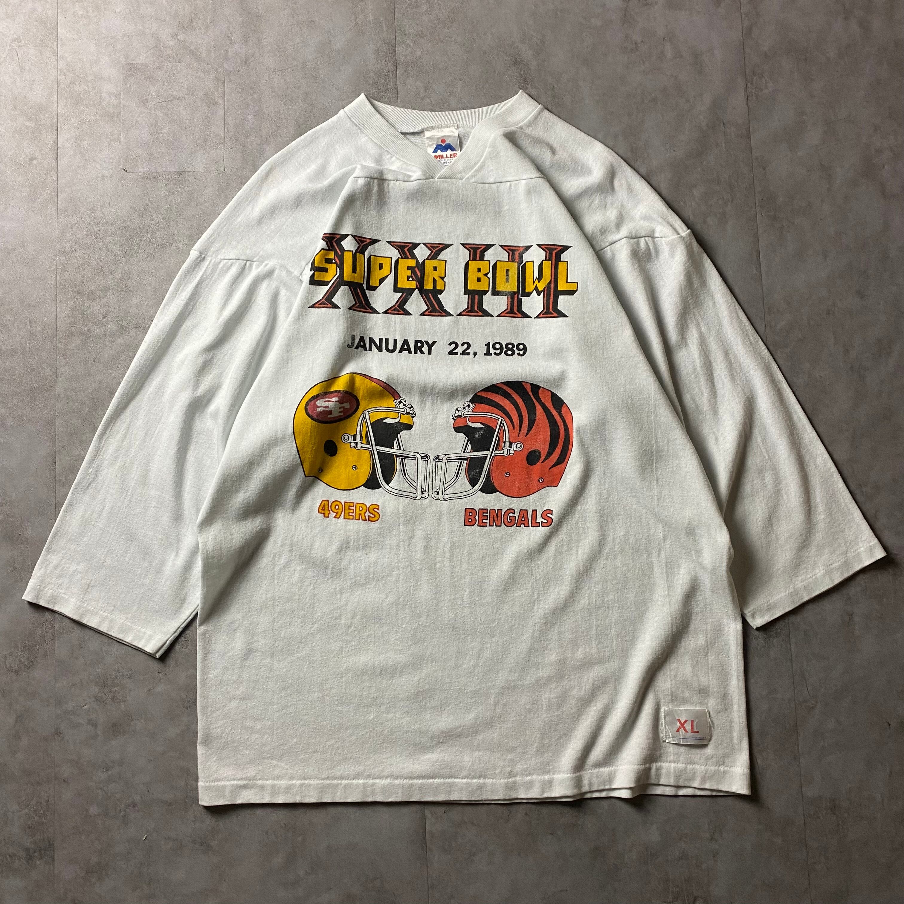 【入手困難】80s USA製 NFL SUPER BOWL フットボールシャツ シンシナティ・ベンガルズ Cincinnati Bengals サンフランシスコ 49ers スーパーボウル シングルステッチ ロンT 7分丈 長袖 Tシャツ 大判プリント vintage ビンテージ miller