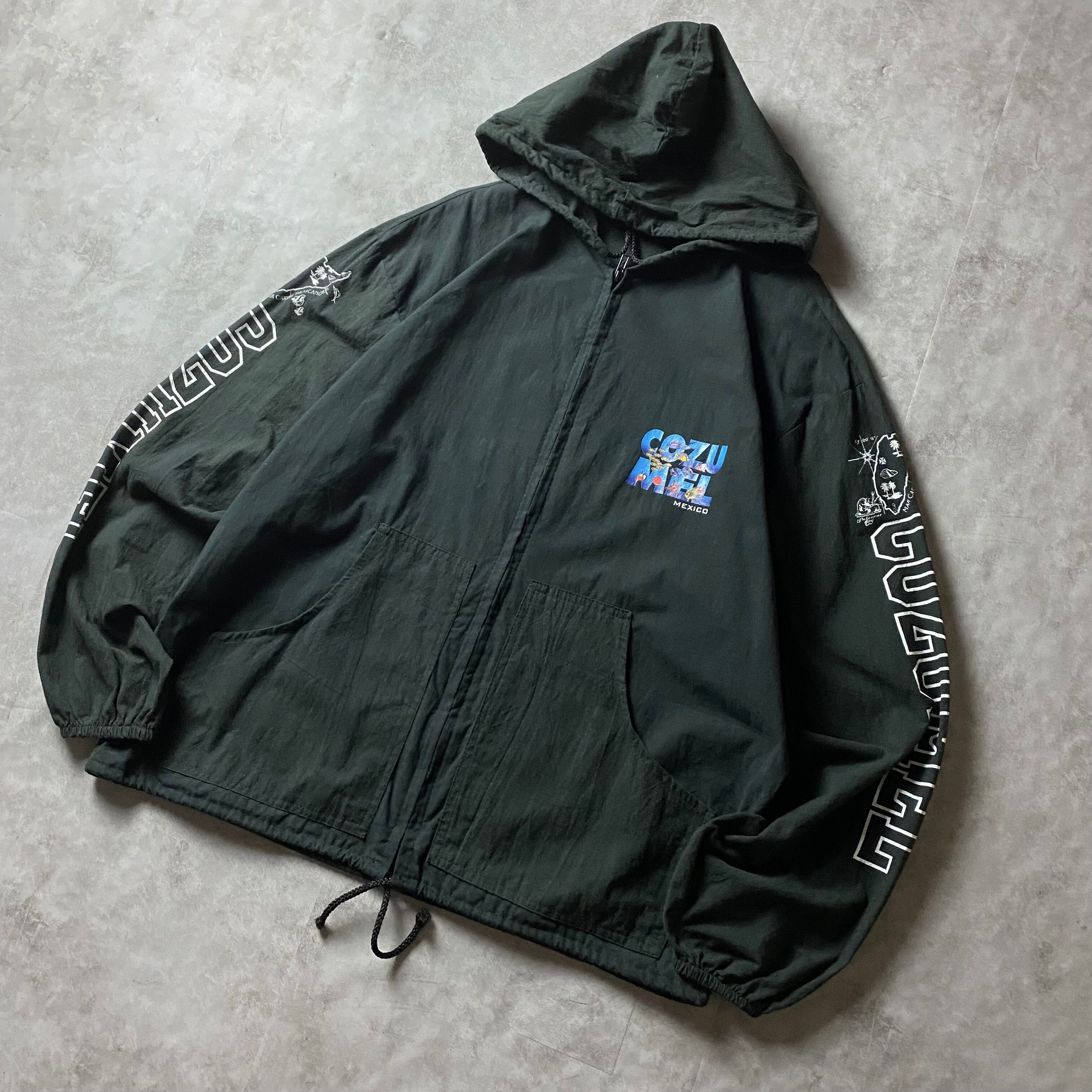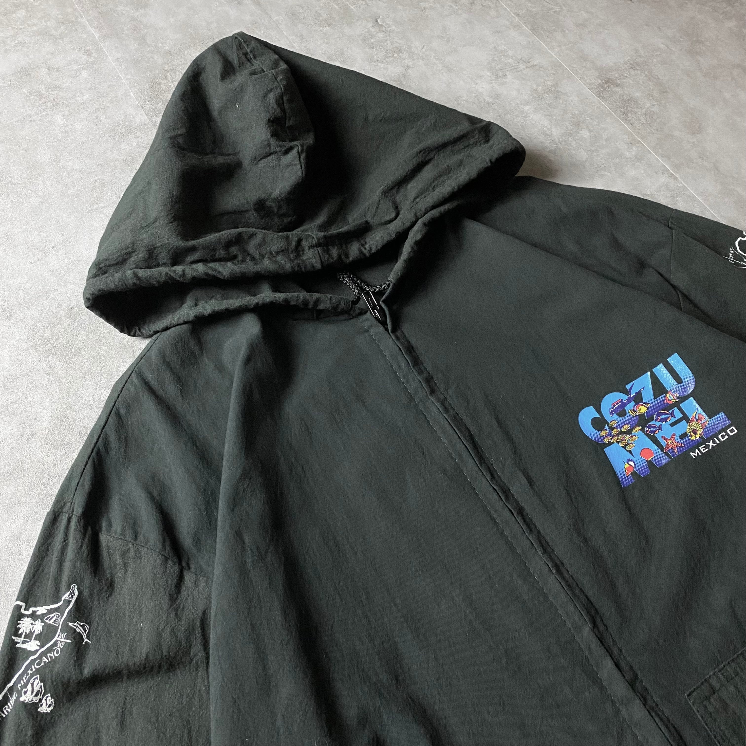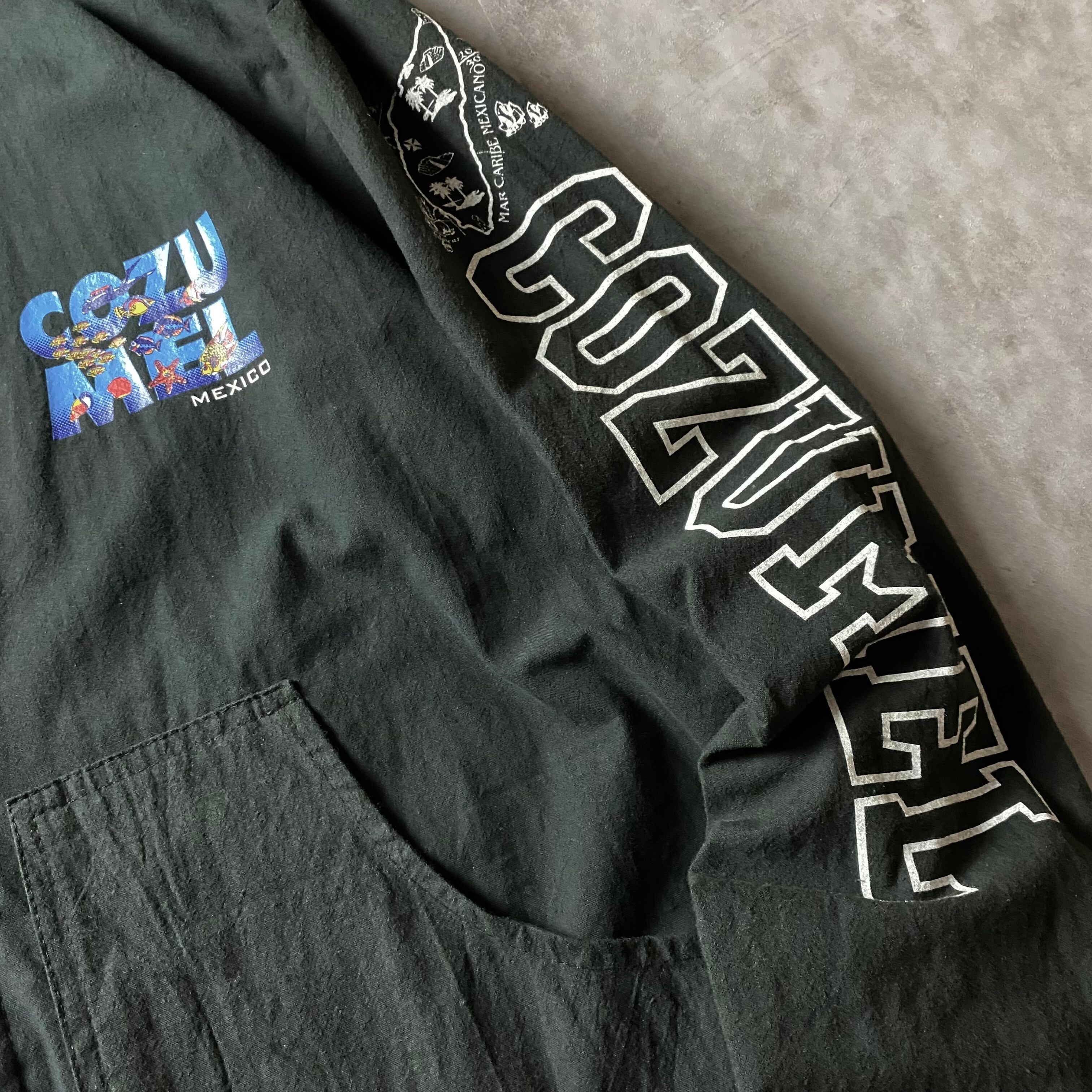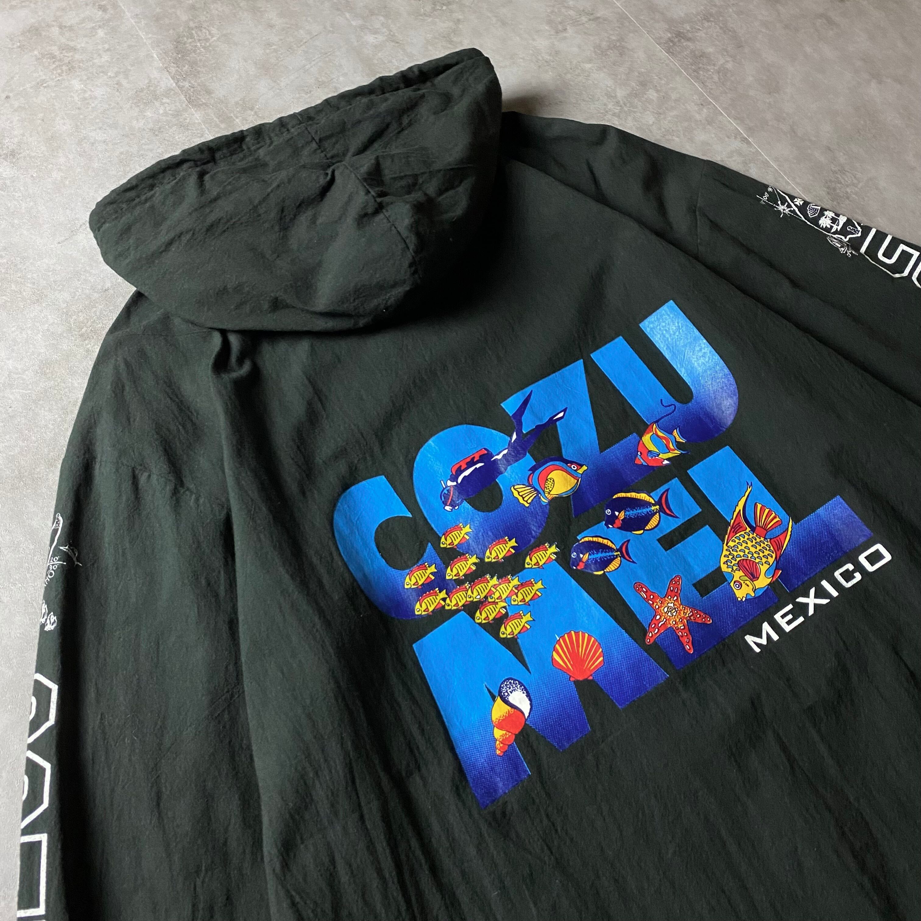 【超希少】芸術 アート 魚 ビーチパーカー 両面プリント ドローコード 黒 XL メキシコ cozumel バックプリント 大判プリント イラスト アニマル柄 アニマルプリント 動物 ダイバー ヒトデ 貝殻 熱帯魚 フルジップ パーカ フルジップパーカー コットンパーカー スリーブロゴ