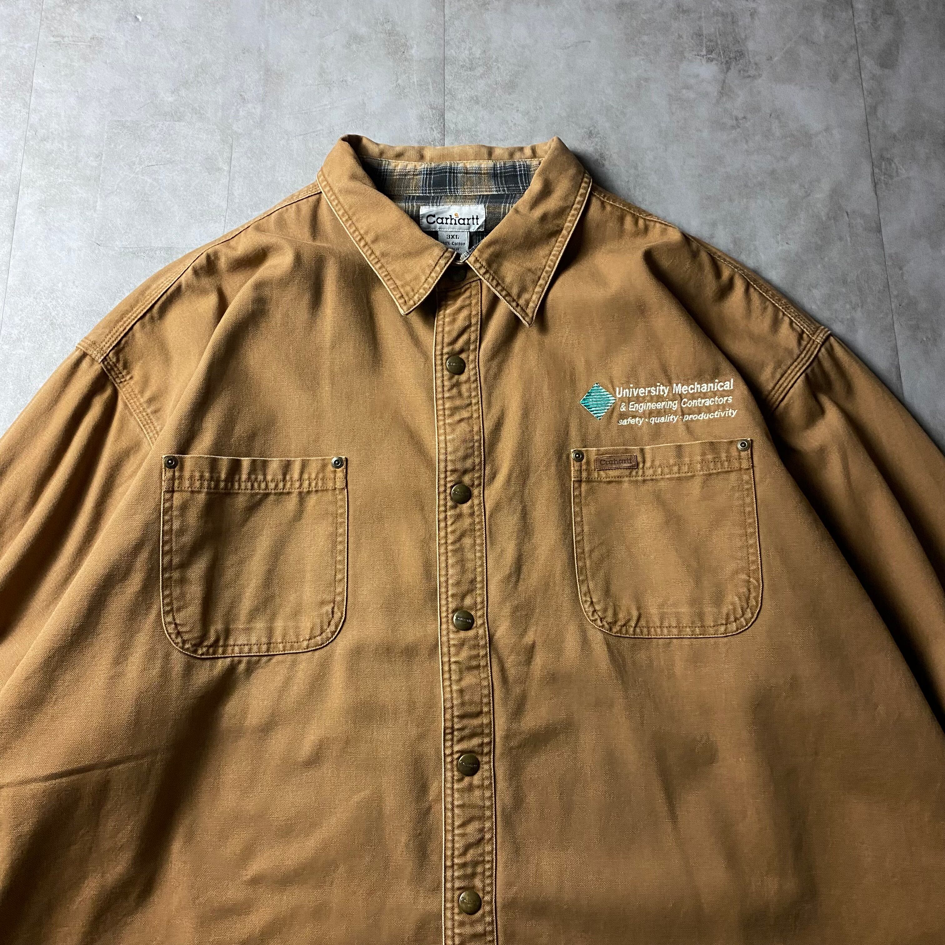 00s Carhartt 企業物 ワークシャツ ダック地 刺繍ロゴ 裏地チェック ダックシャツ 長袖 シャツ ワークウェア 企業ロゴ ダブルフェイス 革パッチ シャツジャケット