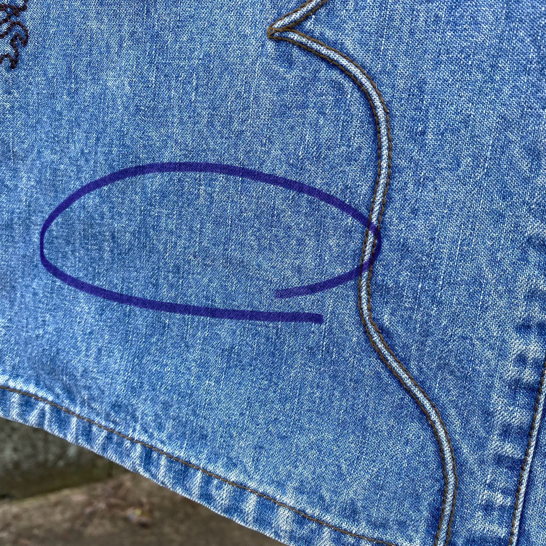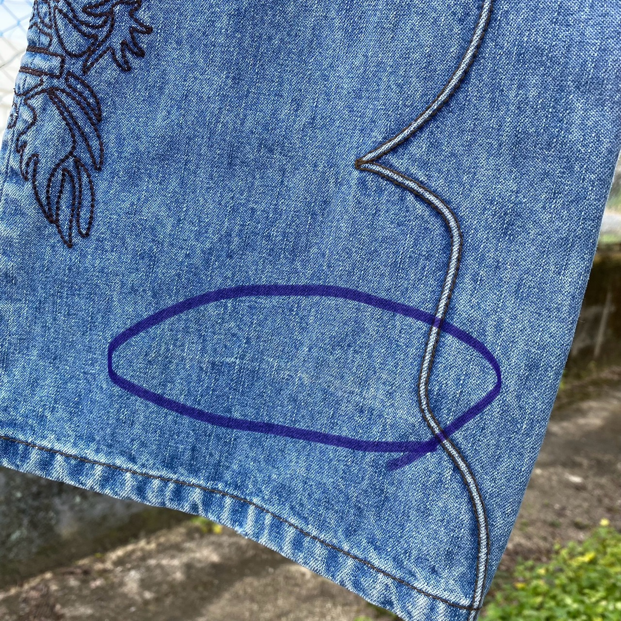ブーツカットのシルエットと刺繍のデザインが個性的な一点です。